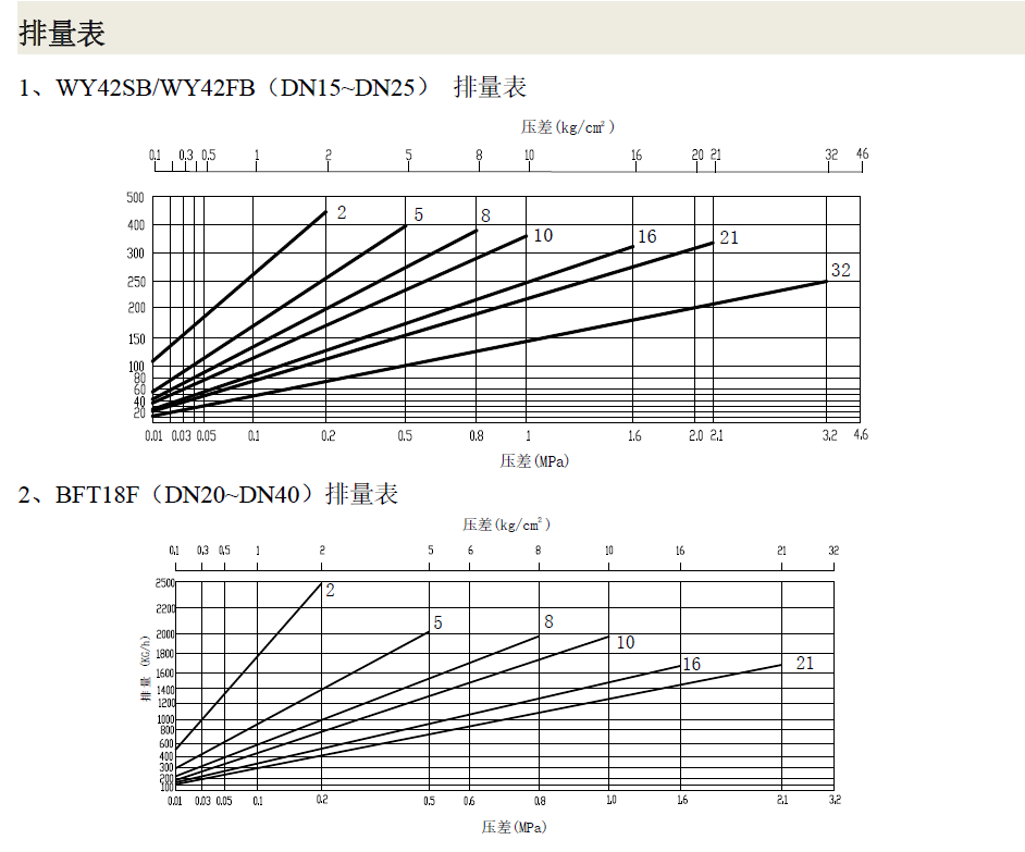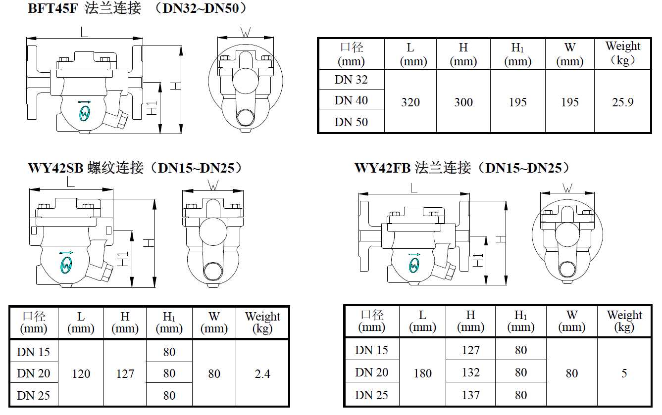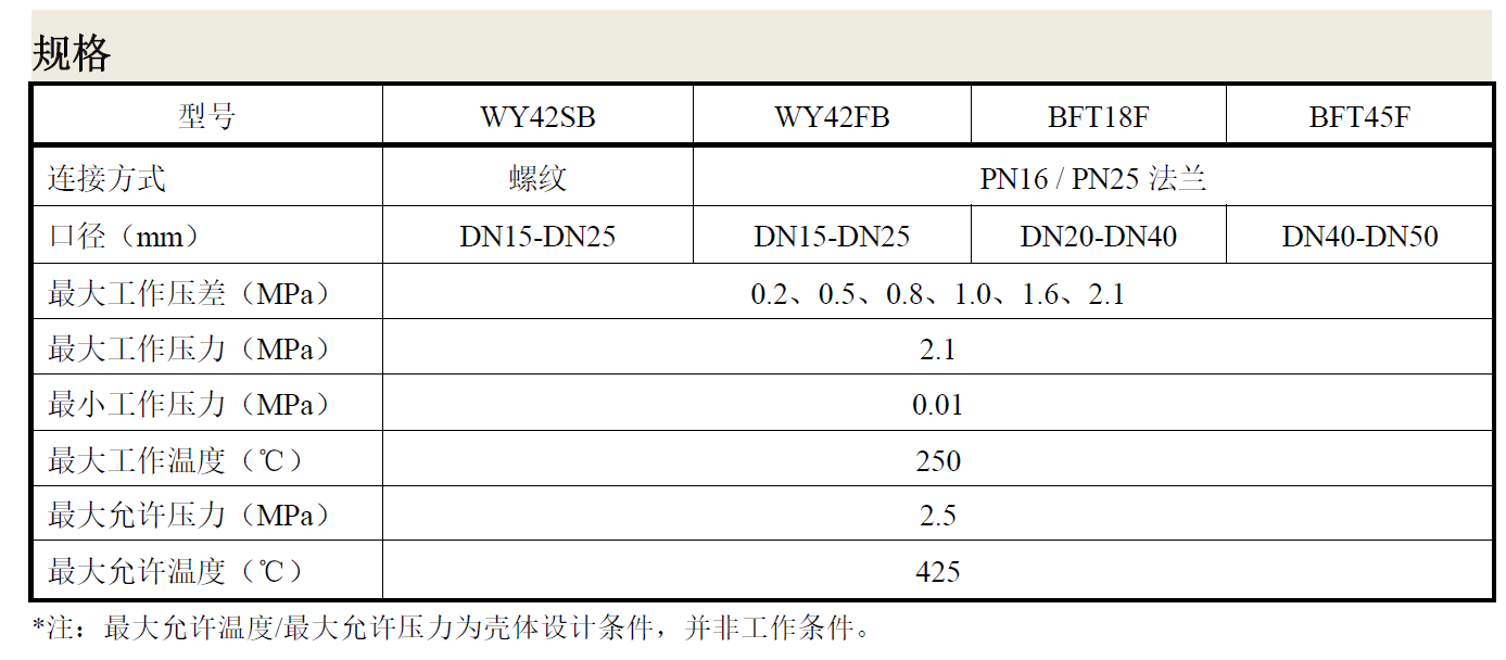 規格:DN15~50,其中WY42SB為螺紋連接, 其他均為法蘭連接。